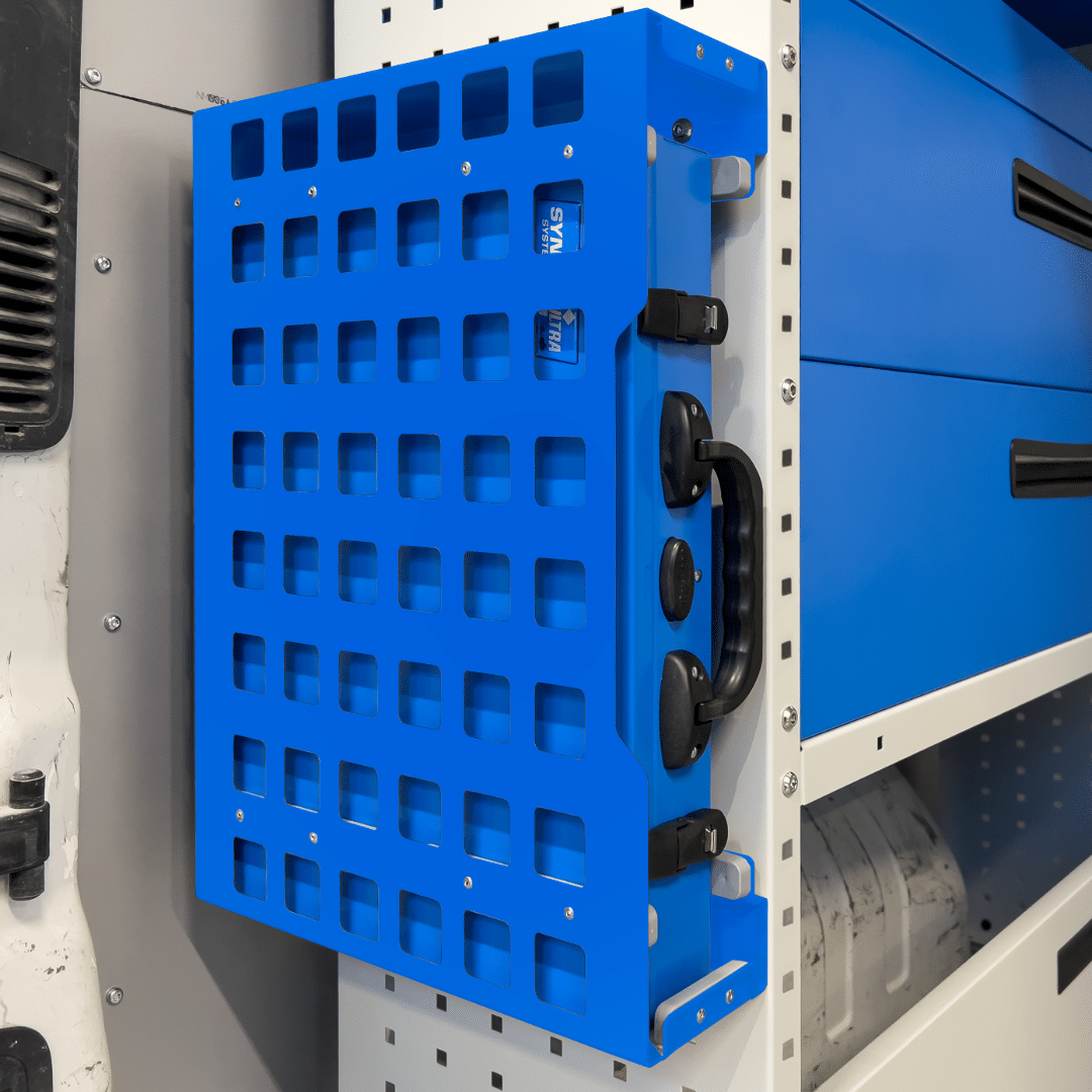 Syncro System kuffertholder. Kan nemt monteres på endegalv af reolsystemet, eller hvor end det giver bedst mening for dig.