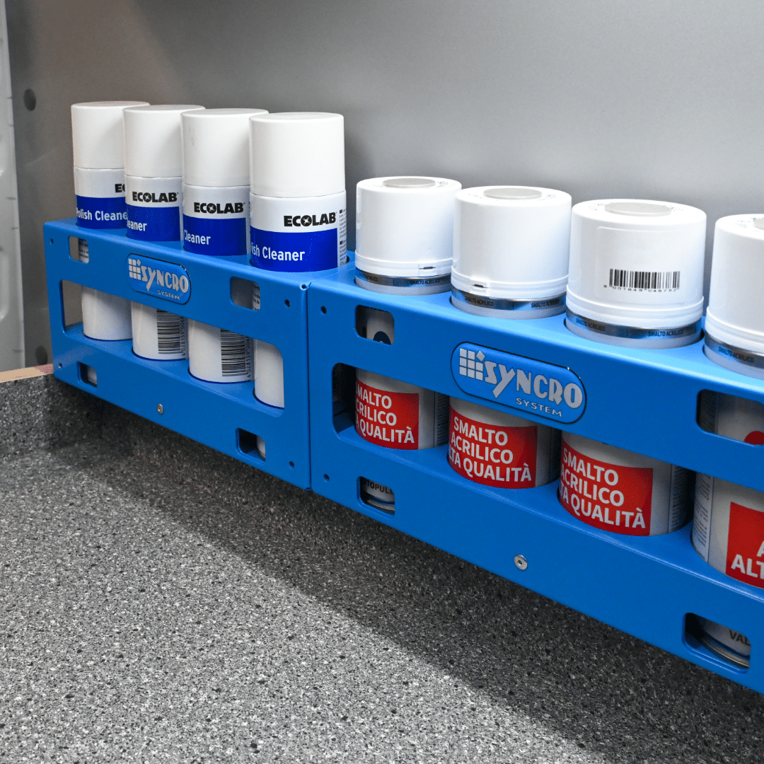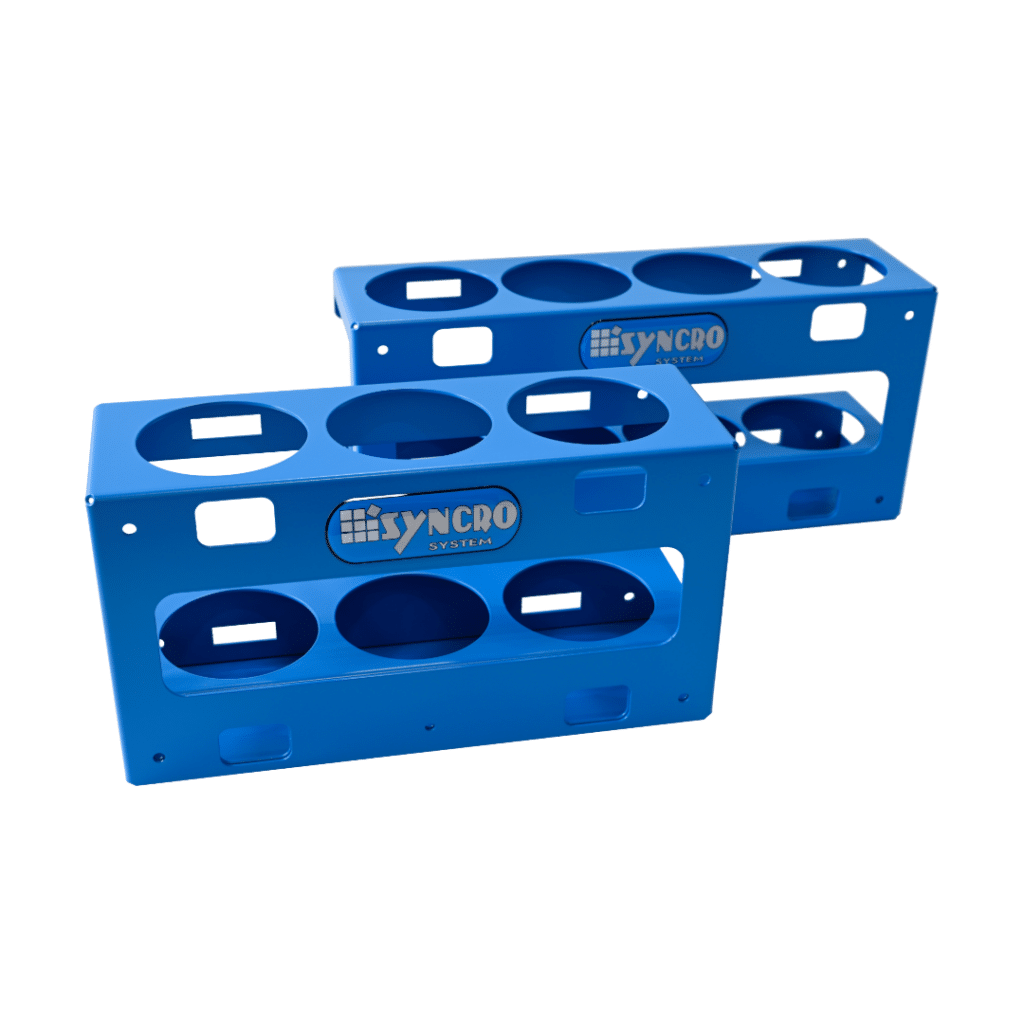 Syncro System spraydåseholder. Huller på Ø 65 mm, passer perfekt til standard spraydåser. Nem at montere direkte på en gavl.
