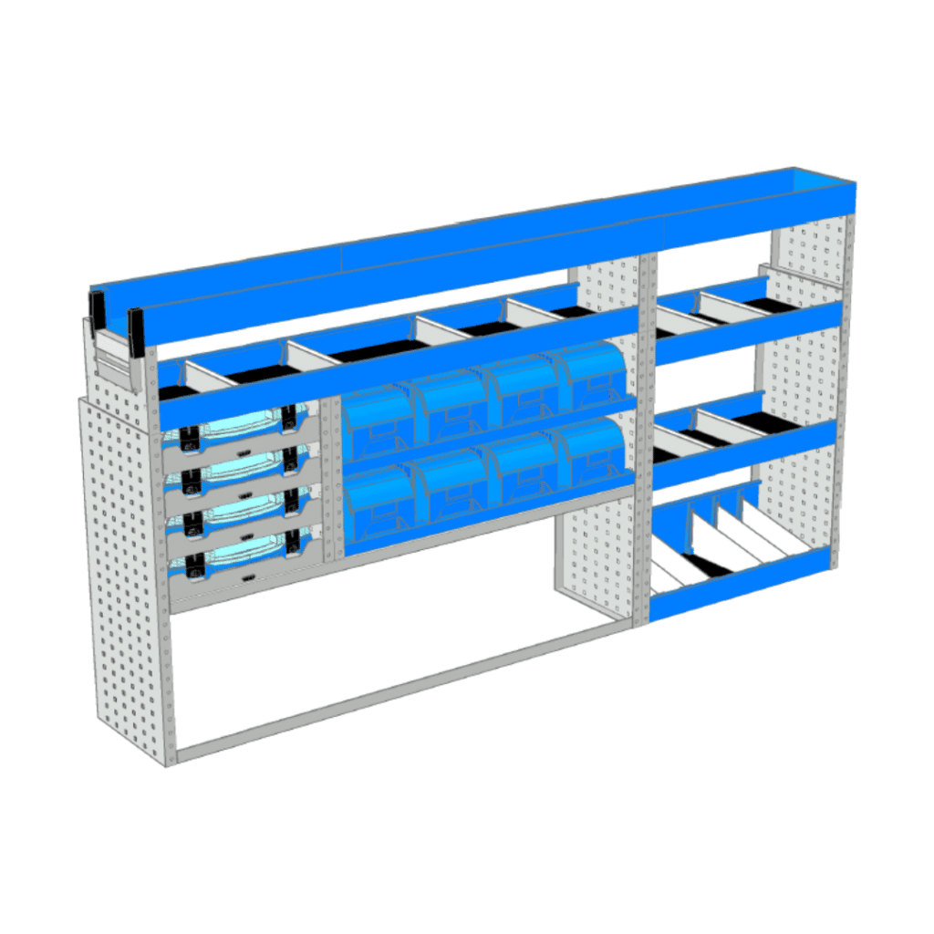 Forrest er der nederst en hylde med høj bagkant og høje inddelinger, perfekt til kabelruller. Er din bil med 2 skydedøre kan den forreste halvdel selvfølgelig vendes så tingene nemt kan nås fra skydedøren.