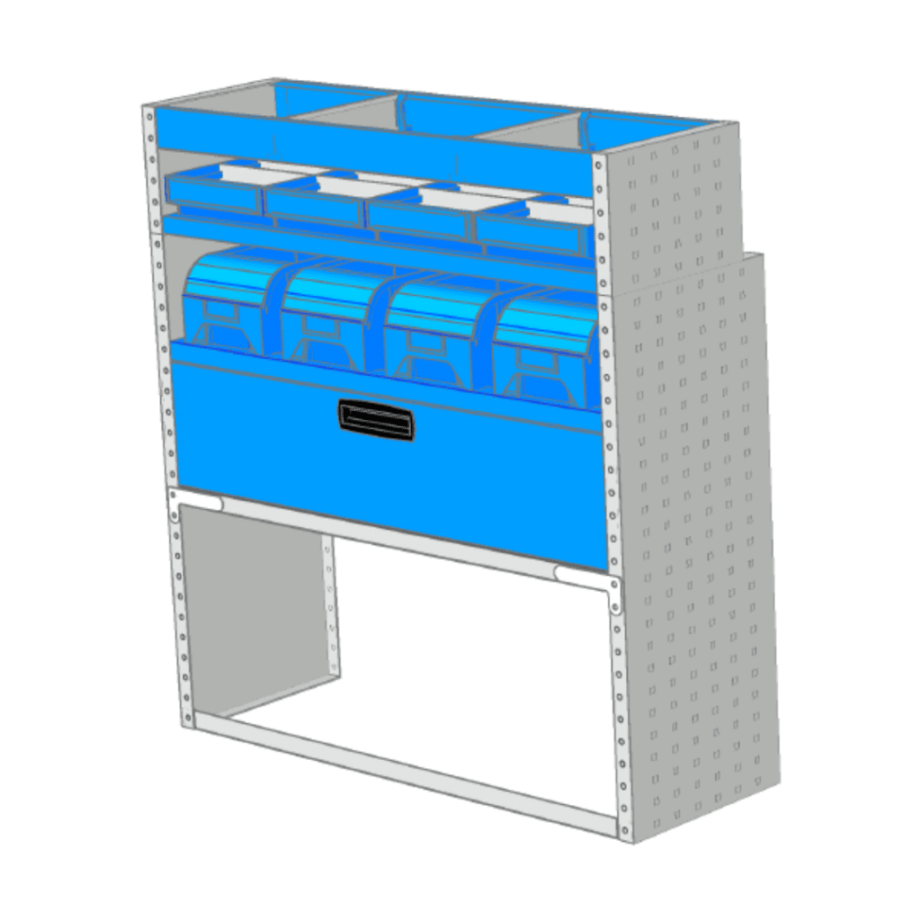 Nederst er reolen med 1 stor skuffe på kugleleje udtræksskinner, som er 942 mm bred og 208 mm høj. Ovenover har vi deres VisionBox med aftageligt klart front panel. Øverst små kasser som standard kommer med 2 rumdelere.